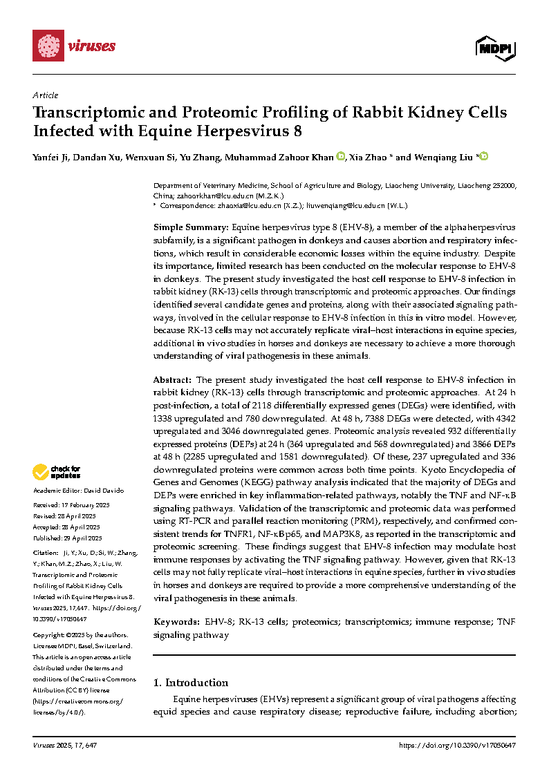 丝瓜视频 2022级动物学专业研究生纪言霏在《Viruses-Basel》杂志上发表了题为“Transcriptomic and Proteomic Profiling of Rabbit Kidney Cells Infected with Equine Herpesvirus 8”的研究论文,指导教师刘文强教授、赵霞博士。