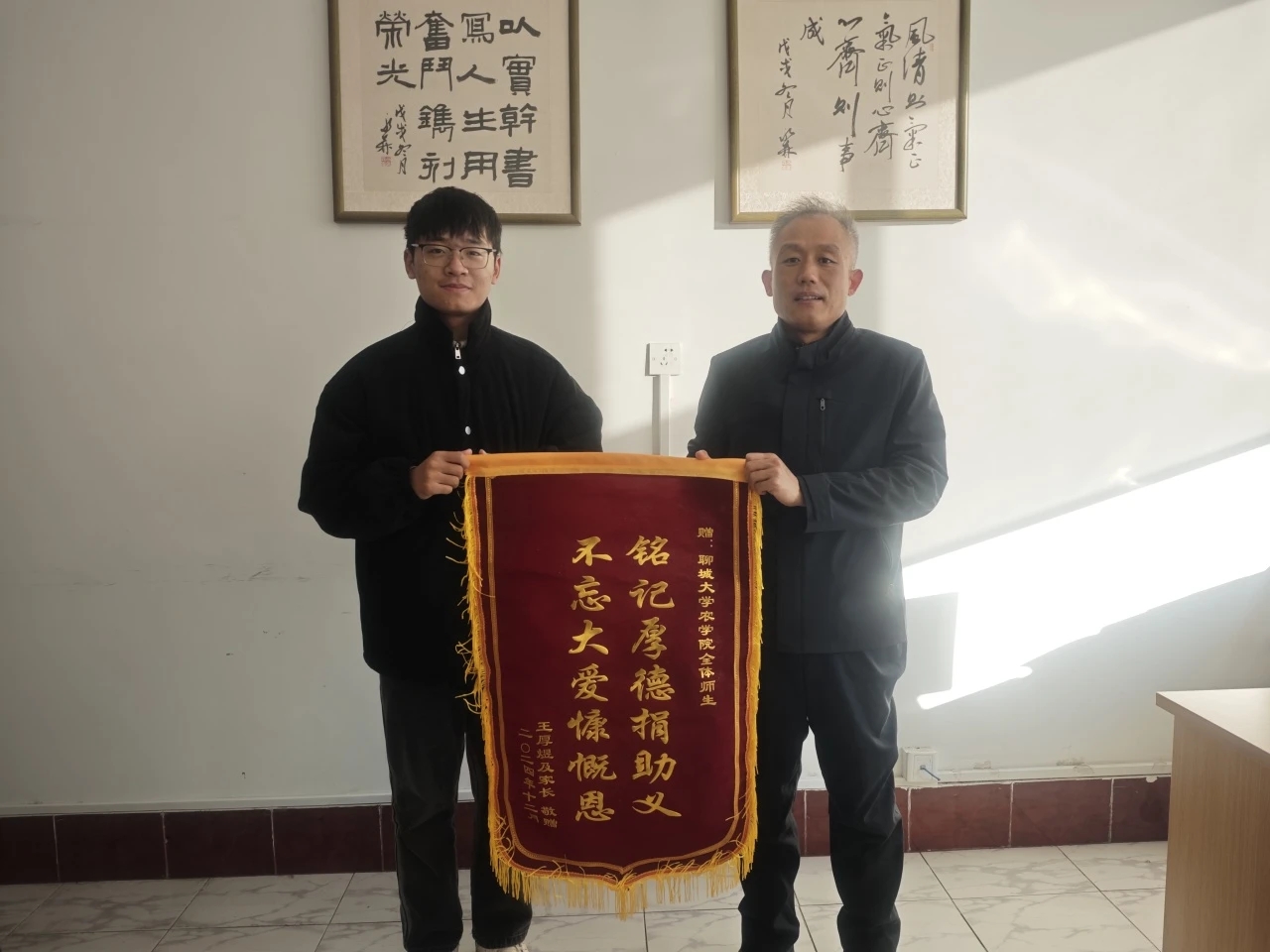 在这个充满爱与希望的世界里,每一个善举都像是一颗璀璨的星星,照亮那些身处黑暗中的人们。近日,一位曾受助于丝瓜视频 师生的学子战胜病魔身体好转,自淄博到我校,亲手送上了承载深深感激之情的一份特殊荣誉。