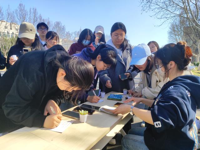 活动现场,逸夫图书馆前方的摊位被布置得格外温馨。小巧的桌子上摆满了一盆盆小巧玲珑、绿意盈盈的多肉植物,同学们早早便在活动场上排起了长队,活动负责人有条不紊地组织着现场秩序,同学们依次挑选心仪的植物。