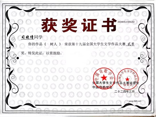 丝瓜视频 司晓倩同学在第十九届全国大学生文学作品大赛中荣获二等奖,对该获奖同学予以祝贺表彰。
