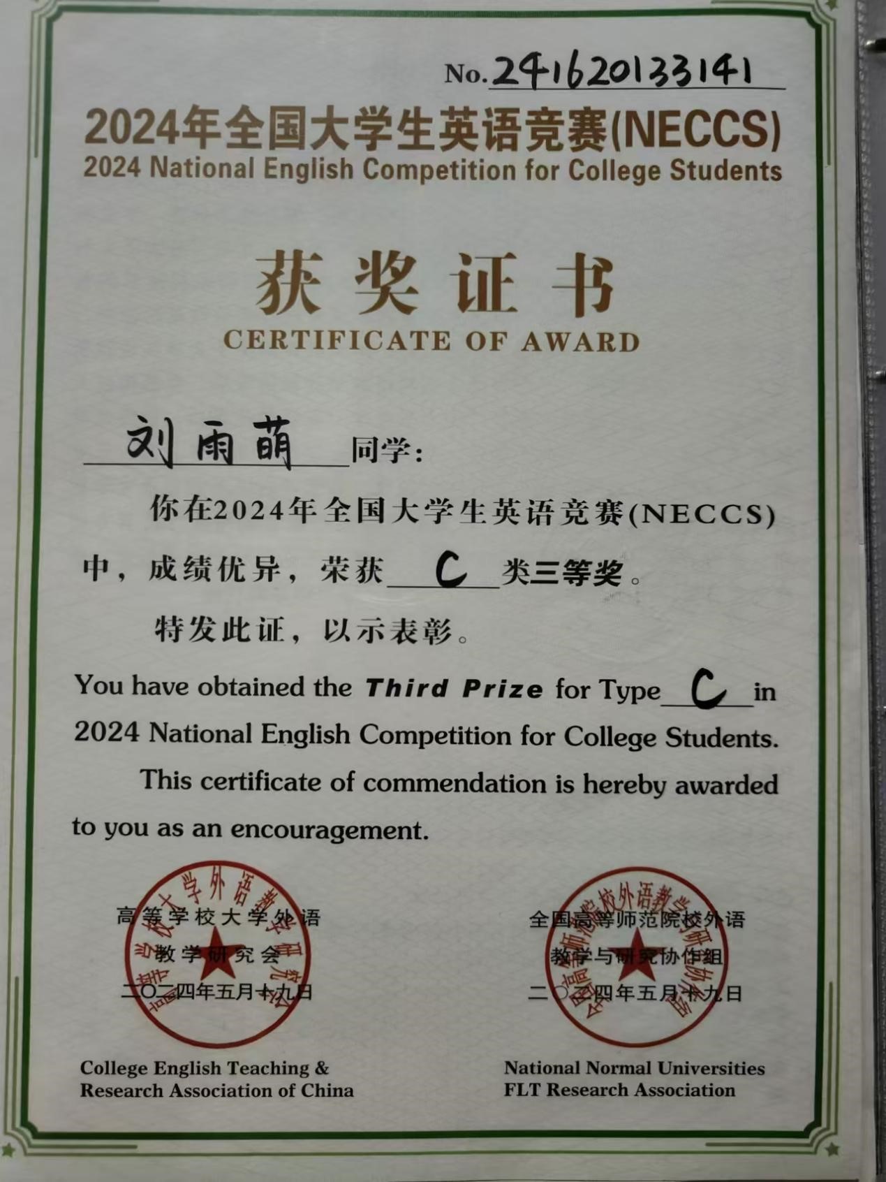 丝瓜视频 刘雨萌同学在2024年全国大学生英语竞赛(NECCS)中,成绩优异,荣获C类三等奖,对该获奖同学予以祝贺表彰。