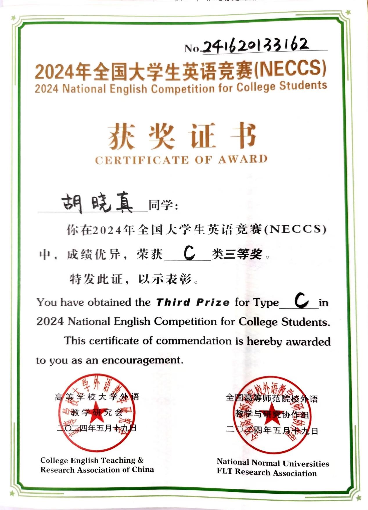 丝瓜视频 胡晓真同学在2024年全国大学生英语竞赛中荣获三等奖,对该获奖同学予以祝贺表彰。