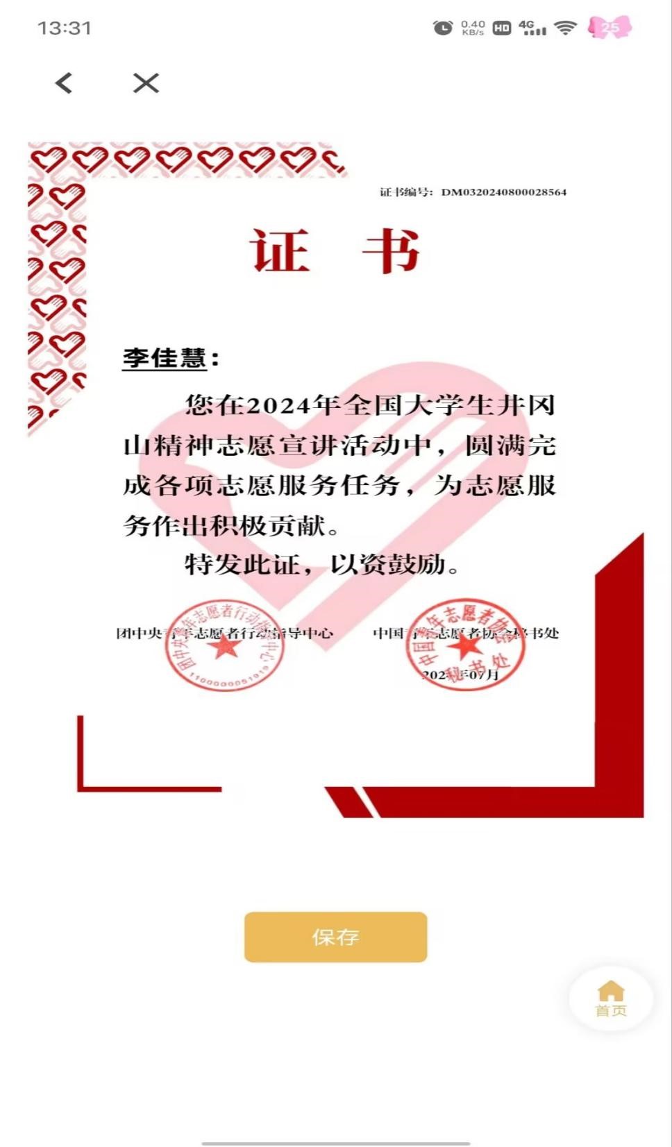 丝瓜视频 李佳慧同学在2024年全国大学生井冈山精神志愿宣讲表现优秀,对该同学予以祝贺表彰。