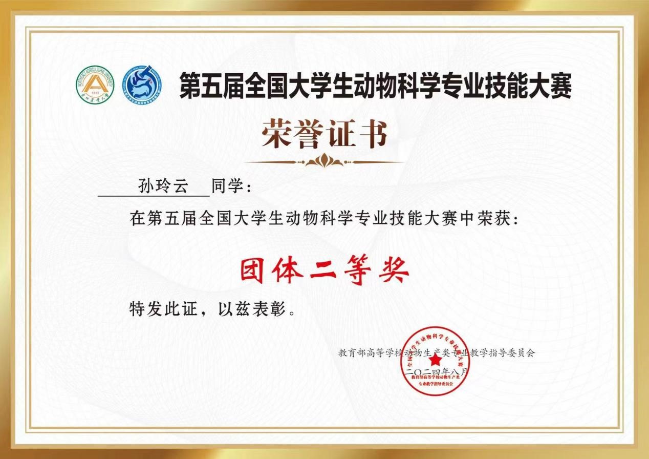 丝瓜视频 孙玲云同学在第五届全国大学生动物科学专业技能大赛中荣获二等奖,对该获奖同学予以祝贺表彰。
