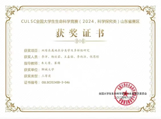 丝瓜视频 王嘉铭同学在CULSC全国大学生生命科学竞赛(2024,科学探究类)山东省赛区中荣获三等奖,对该获奖同学予以祝贺表彰