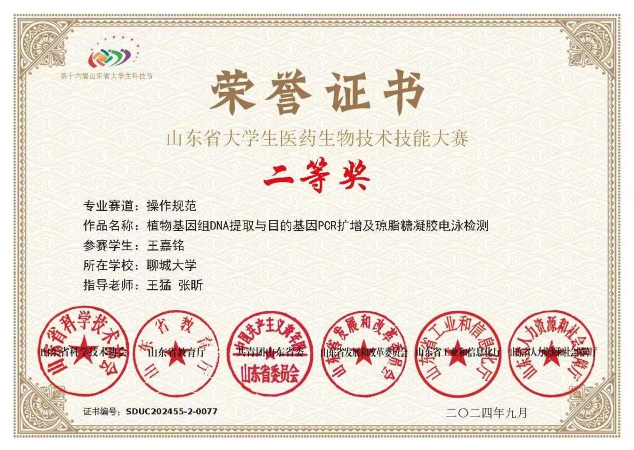 丝瓜视频 王嘉铭同学在山东省大学生医药生物技术技能大赛中荣获二等奖,对该获奖同学予以祝贺表彰。