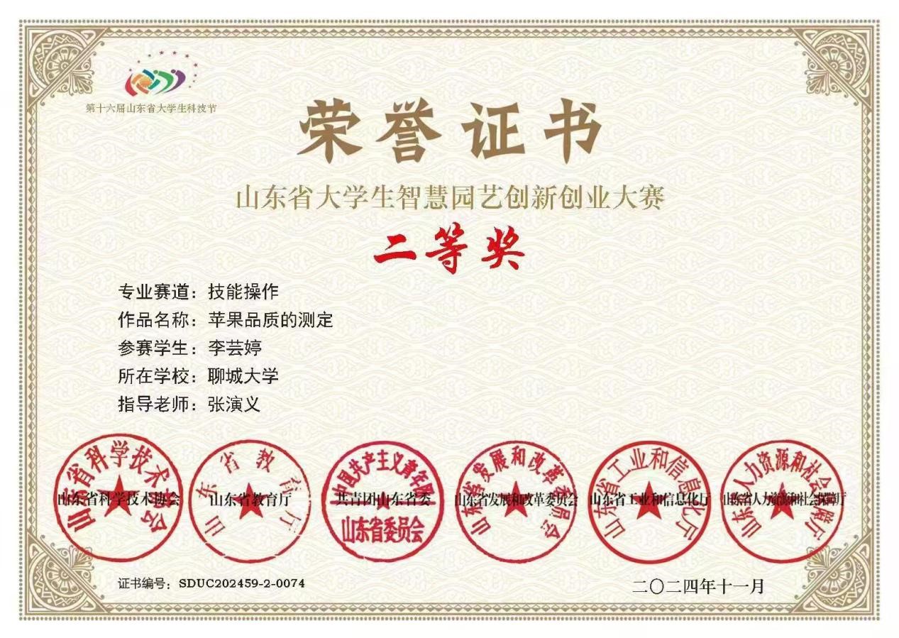 丝瓜视频 李芸婷同学在山东省大学生智慧园艺大赛中荣获二等奖,对该获奖同学予以祝贺表彰。