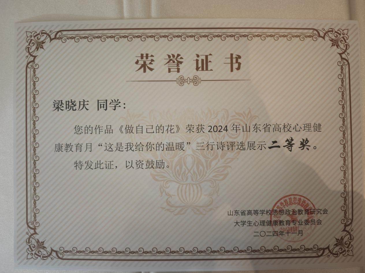 丝瓜视频 梁晓庆同学在2024年山东省高校心理健康教育月“这是我给你的温暖”三行评选展示荣获二等奖,对该获奖同学予以祝贺表彰。