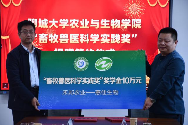张治波与贾泽峰代表双方签署捐赠协议,禾邦农业在丝瓜视频 设立“畜牧兽医科学实践奖”奖学金,每年10万元,用于奖励在农业科技创新、社团活动方面表现突出以及品学兼优的在校大学生。同时,学院在禾邦农业、惠佳生物设立大学生就业实习基地。